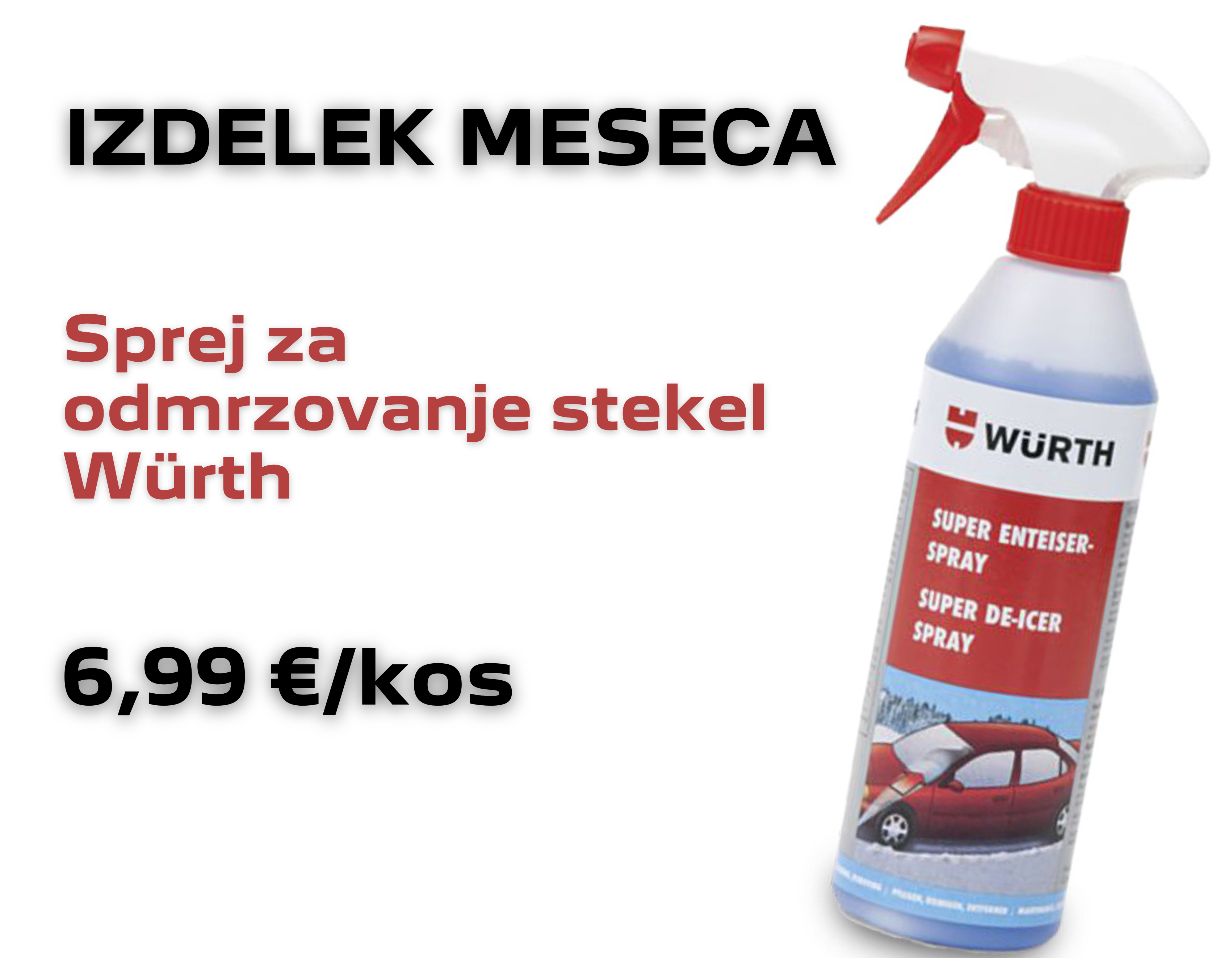 *Kataloška številka izdelka meseca sprej za odmrzovanje stekel Würth je W0892331201. Cena izdelka vključuje DDV in velja od 1.12.2025 do 28.02.2026 oz. do razprodaje zalog. Pred koriščenjem ponudbe vam svetujemo, da preverite razpoložljivost izdelkov. Pridržujemo si pravico do morebitnih sprememb in napak v ponudbi. Slika izdelka je simbolična.